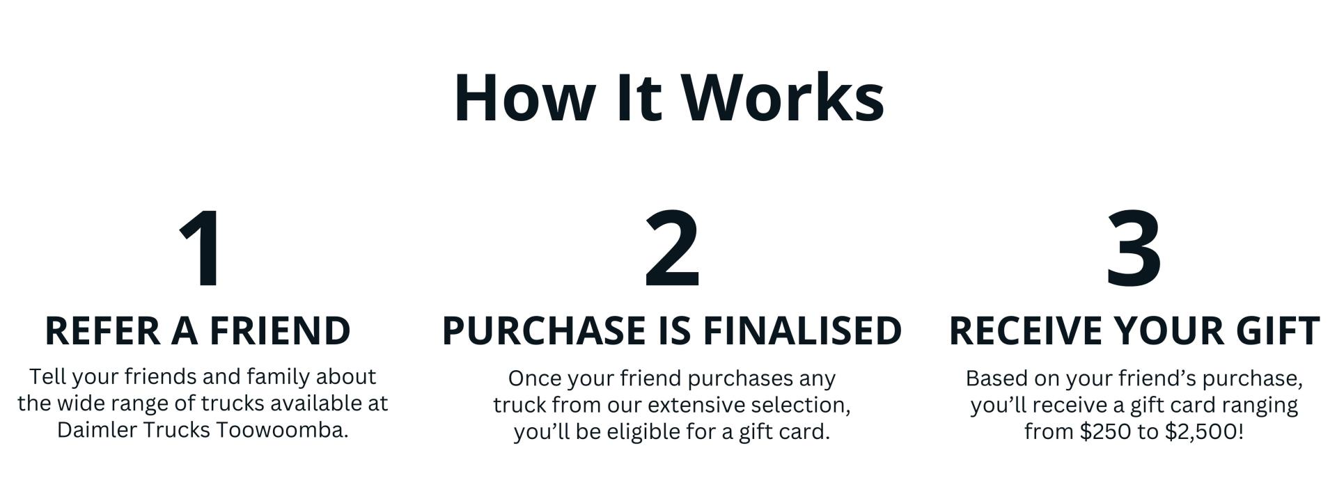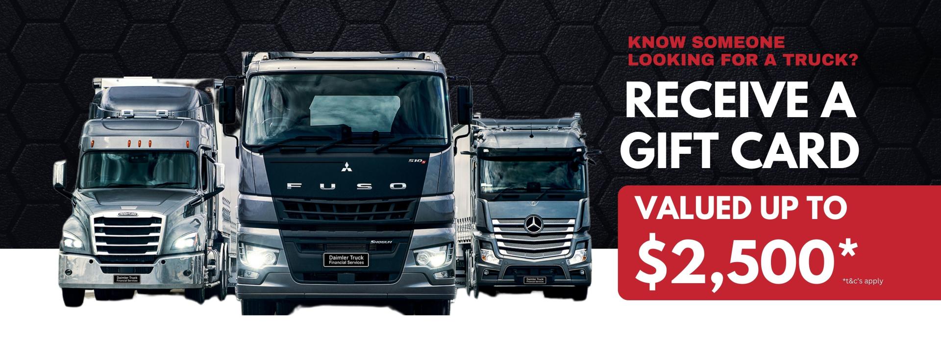 Terms and Conditions: Offer valid for truck purchases only. Referral rewards depend on the truck purchase made by your friend. This promotion is not valid with any other offers. Daimler Trucks Toowoomba reserves the right to change the promotion at any time.